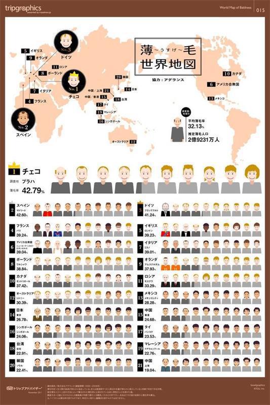 但是一山更比一山高,强中自有强中手,早在2011年,日本就做了一个针对全球男性脱发问题的调查,公布了一张“世界秃头地图”,排名第一的是捷克,第二名是西班牙,德国、法国和英国紧随其后,中国排名二十一,秃头率为19.04%。