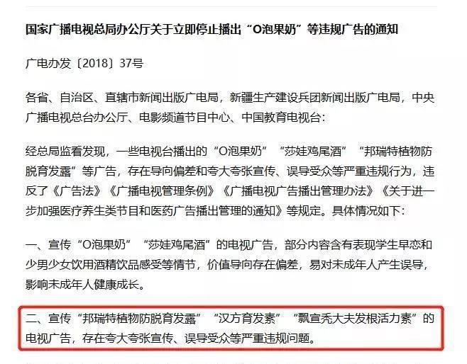 2018年6月,广电总局就直接禁止了宣传“邦瑞特植物防脱育发露”、“汉方育发素”和“飘宣秃大夫发根活力素”的电视广告,称其存在大夸张宣传、误导受众等问题。