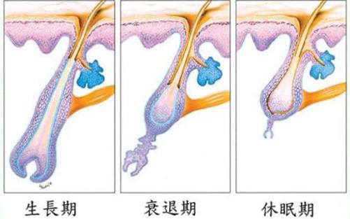 头发生长细胞分裂负责头发生长周期。新细胞将头发向前推,使其更长。健康的头皮上有大约100000根头发。这些毛发在正常健康的条件下,可持续一至六年。在正常条件下,每天脱落约100根头发。脱落的头发会被新的头发所替代。这样不断的交替进行所以就不会秃发。在头发的生命周期中会经历了三个阶段,生长期,休止期和退行期。生长期是头发生长的第一阶段。退化是下一阶段,当毛发停止生长,因为细胞分裂停止。休止期是最后阶段。新的头发开始在乳头生长,最后老头发掉下来。头发以相同的速度在头上生长。两鬓,头顶,后枕部,它们之间没有明显的区别。
