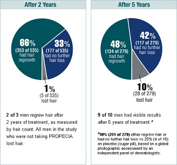 对数千名男性进行的临床试验表明,在使用2年后,66%(三分之二)的男性头发生长量增加。30%的男性有轻度改善,31%有中度改善,5%有显著增加。试验中有83%的男性没有进一步脱发。