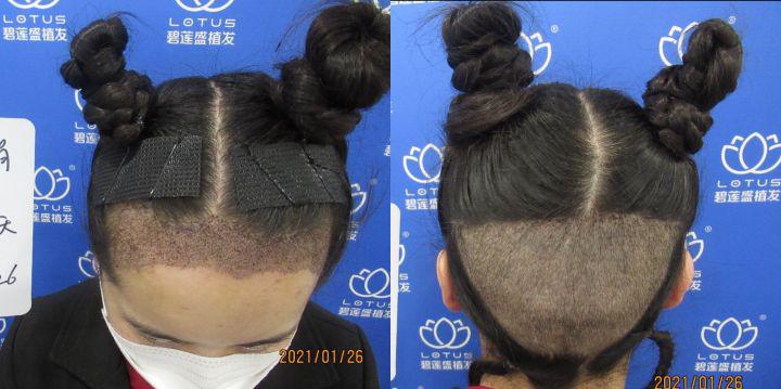 植发手术前:发友天生发际线高,需要把后枕部位的头发一部分剃光,方便取发。