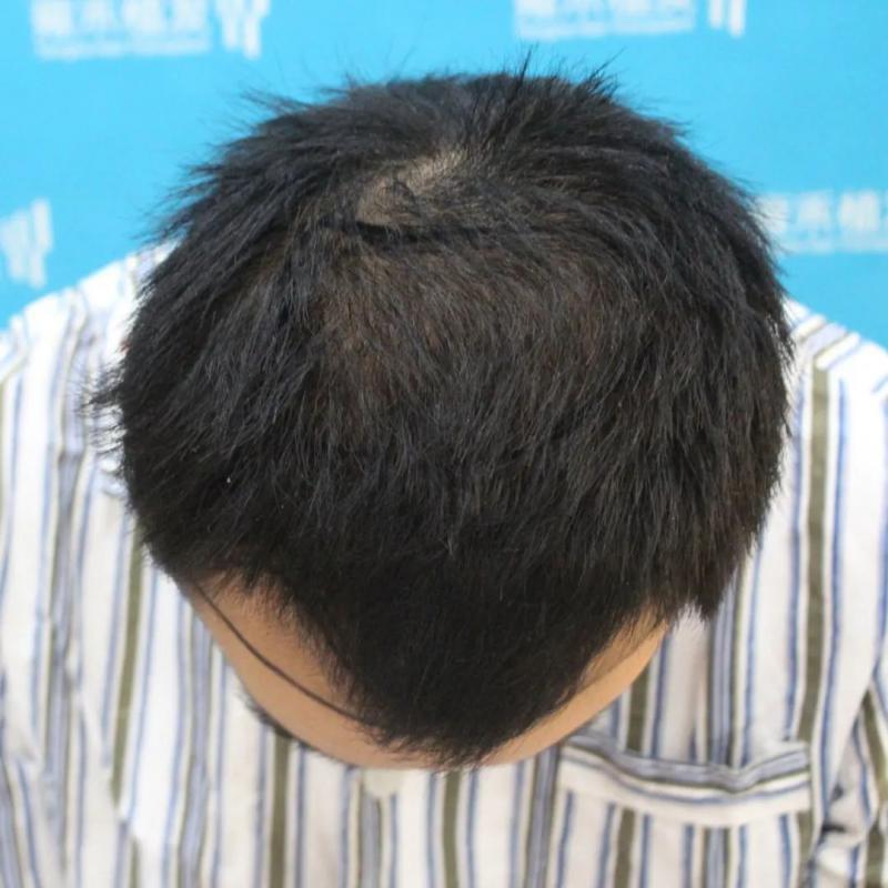 小张属于典型的m型脱发,额角只剩下一些长不长的小绒毛了,头旋处也能很明显看出来稀疏了不少。