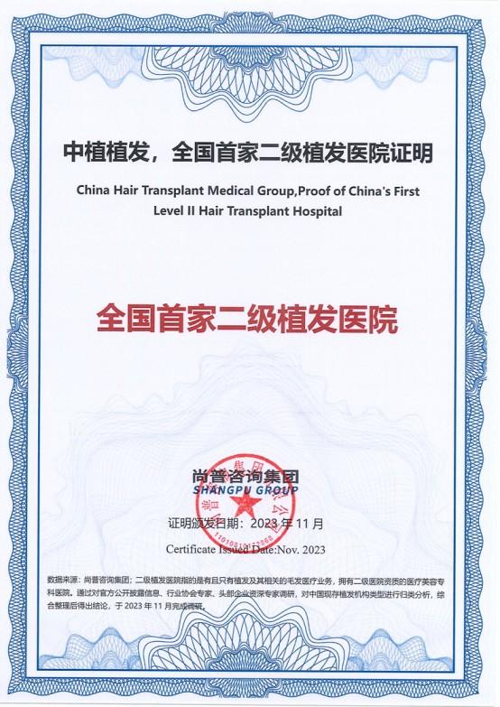2023年11月,尚普咨询集团有限公司(以下简称“尚普咨询集团”)对植发市场进行深度调研,经专家和企业调研以及终端销售渠道交叉验证后,给郑州中植植发医院,颁发了“中植植发,全国首家二级植发医院”的市场地位声明认证!