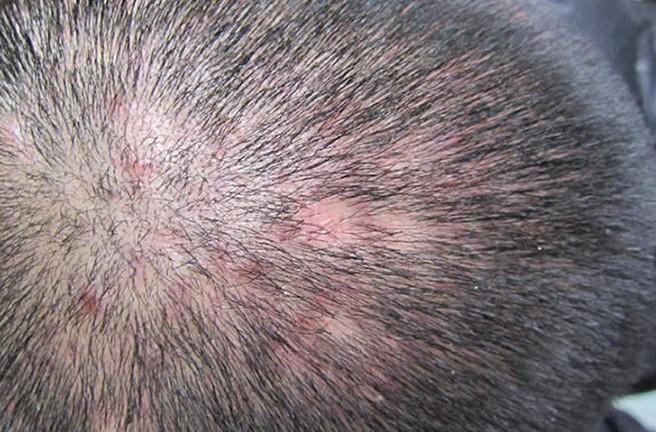▶头皮发红、有一片片红色色斑或者暗黄色色斑,有皮屑或鳞屑现象;