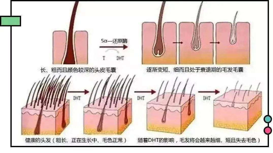 在所有脱发类型中,雄性激素性脱发是最常见的,占脱发人群的90%以上,这类脱发的诱因除遗传因素外,还受到体内DHT的影响。