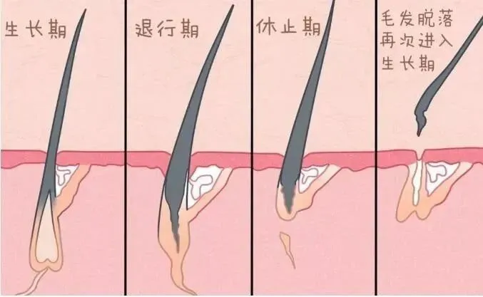 说到脱落期就不得不提到头发的生长周期,每个毛囊都有自己的代谢周期:生长期、休止期和脱落期。