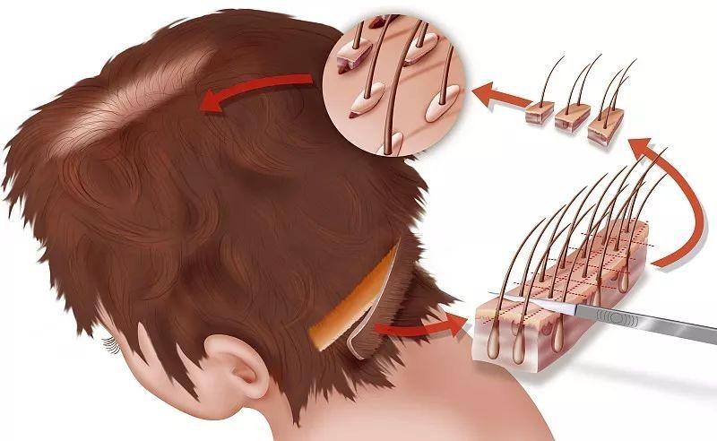 是从后脑勺取下事先规划好需要切取的头皮,然后把头皮条按毛囊单位的自然生长方向进行分离。