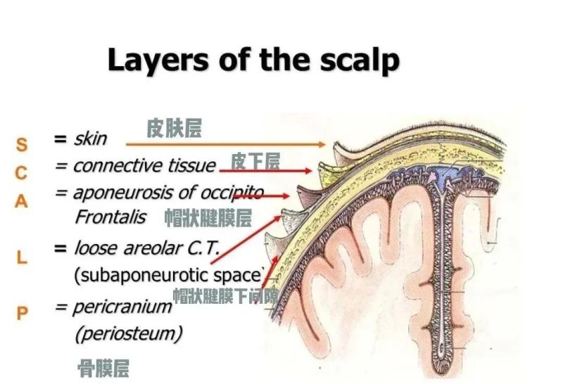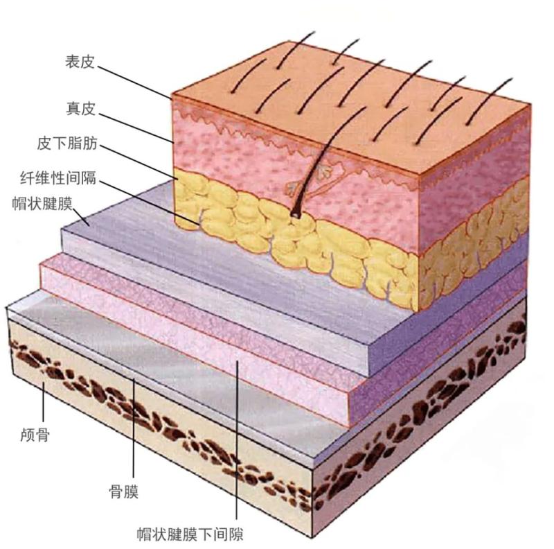 从医学解剖层次上来说,人类的这5层头皮从外到内,依次是皮肤层、皮下层、帽状腱膜层、结缔组织层、骨膜层。