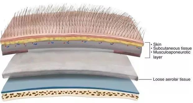 这个区域非常容易分离,在进行头部手术时,分离的区域常是此层次,厚度在分离前正常状态<0.5mm。