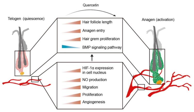 2023年,首都医科大学的研究人员在《Protein Cell》发表题为“Single-cell profiling reveals a potent role of quercetin in promoting hair regeneration”的研究论文。研究发现发现槲皮素(Quercetin)通过激活内皮细胞中的 HIF-1α 刺激毛囊中的分化轨迹并诱导真皮内皮细胞中的血管生成。