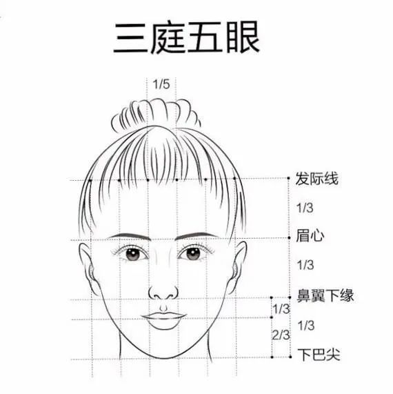 美术中的“三庭五眼”,如三庭:指脸的长度比例,把脸的长度分为三个等分。