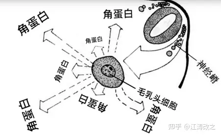 转录表达谱分析表明,部分毛乳头细胞来源于神经嵴,在毛囊分化过程中,促进毛囊角质化,最终形成坚硬的结构和不同形态。因此,我们发质的好坏、头发的粗细、头发的生长时间皆由毛乳头决定,无论怎样剃发,都无法触及对毛发起决定性作用的毛乳头。