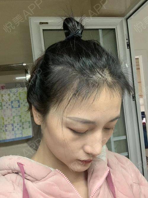 今天到医院来做了清洗,看起来还好,挺自然的。前两天没睡好,有点憔悴,头皮看着还有点红红的。可以把头发放下来遮一下了。