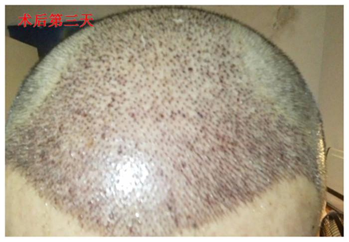 植发第三天,植发区域无感觉,取发区有痛感,紧梆梆的,特别是晚上睡觉的时候压着有点痛,但没有渗液,比较干净