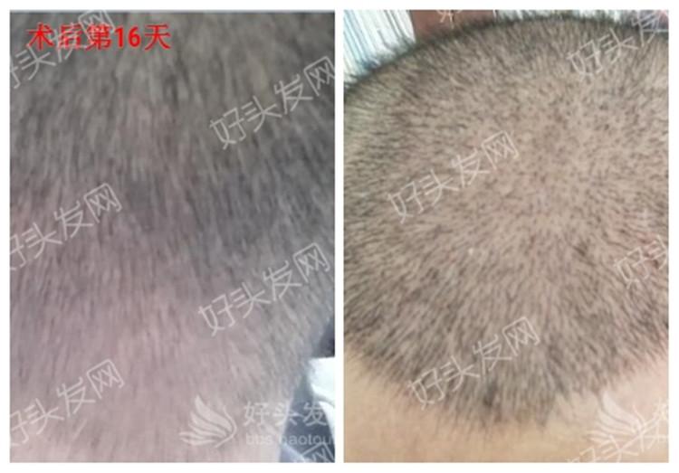 今天第16天了,这几天植发区和取发区特别痒,应该是在恢复,忍住不抓,取发区还有点紧梆梆,不过不痛了,有点红,每天涂碘伏,没毛囊炎,药准备不用,上图