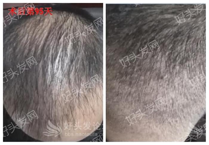 今天第95天了,脱落期已经过去,后面取发区也恢复正常,留长点看不出取发过,早上喷米诺,晚上喷707,每天晚上一片非那,虽然不清楚副作用如何,但还是为了效果开始吃,暂时没看见什么副作用,长出来的头发还不多,希望快点生长吧