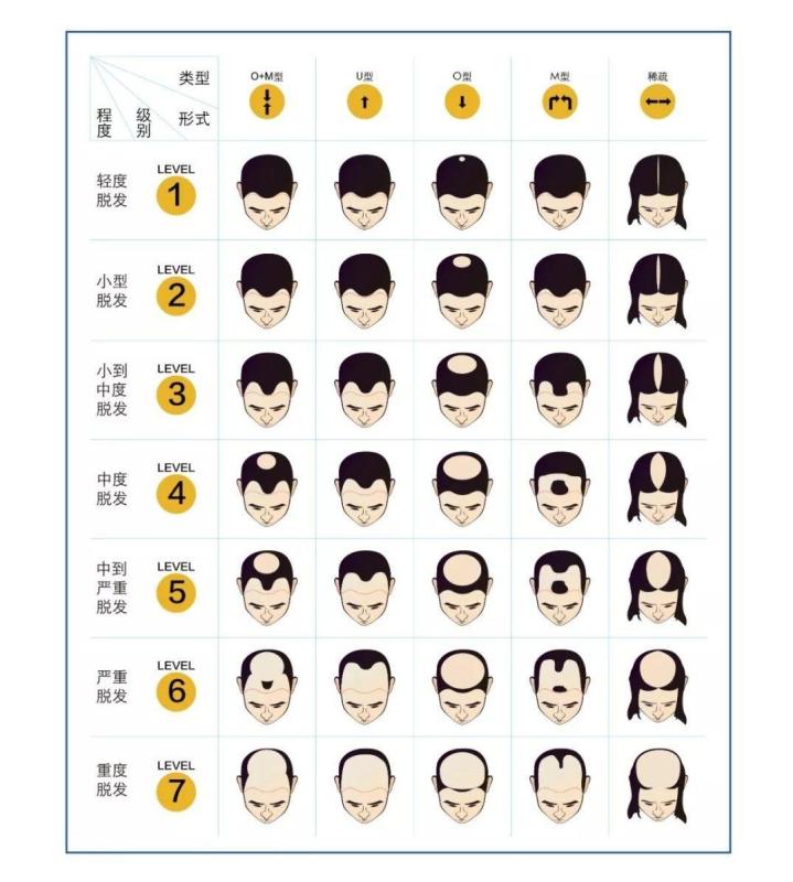 其中,1级、2级属于轻度脱发,3级、4级属于严重脱发,5级、6级、7级属于秃头。