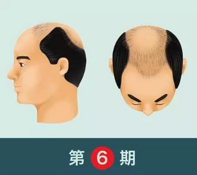 6级脱发马蹄形脱发,侧面和后面脱发区增加。