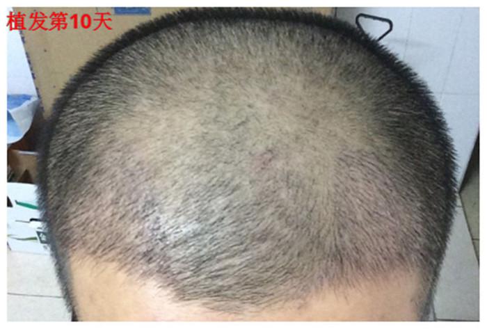 今天是手术后第10天!可以看到血痂基本上清理干净了,但在植发区还是看到颜色有区别!从近处能看到颜色有区别,从远处别人看还以为只是头发剃的比较短而而已!后脑的取发区这两天特别的痒!从正面看,这样的效果我已经很满意了!今晚跟妹纸出去约会时她都没看,