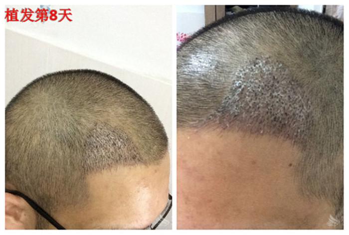 今天是手术后的第8天,已经洗了3天头了,植发区还是有很多白色的角质,这个挺难清洗!植发区一眼看过来还是很明显!
