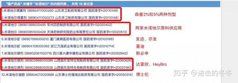 我之前在国家药监局官网上查过“米诺地尔”的相关信息,先给大家交代下米诺地尔这个产品的主要玩家,官网上显示:目前一共有6家具备米诺地尔产品生产资质的制药厂、2家原料供应商。然后我一一对应,按图索骥去各家制药厂的官网查了下,又咨询了一个制药学方面的朋友,了解到目前市场上的国产米诺地尔品牌主要有8家,分别是:森曼(处方药)、发迹、亦发、蔓迪、斯必申、达霏欣、HeyBro、博士伦。