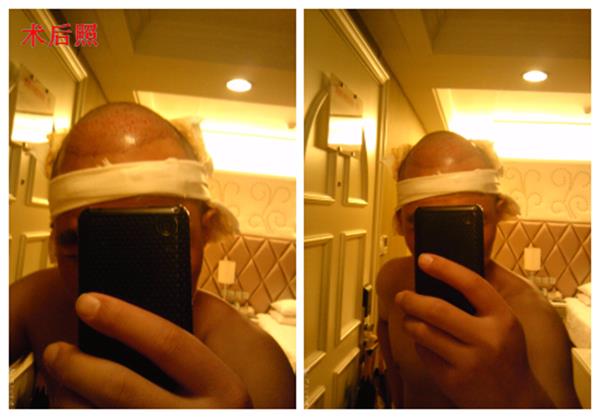 手术前体检测血压抽血化验,设计发际线,护士拍照,缴费。然后开始手术,我的手术是在下午两点半正式开始的,整个过程持续了三个小时。确实有点煎熬,但这是每个想要重生的人必经的。一直到晚上九点多才结束,护士又给拍的照,嘱托术后注意事项,睡觉前不要喝水,睡觉时躺着不要侧卧,不要用手碰植发区,出门带防尘帽,术后按时按量吃医生拿的消炎药,如果疼痛难忍医生拿的还有止痛药没有疼痛的情况就不用吃了,术后第一天换纱布,第二天拆掉纱布,第五天清洗血痂。