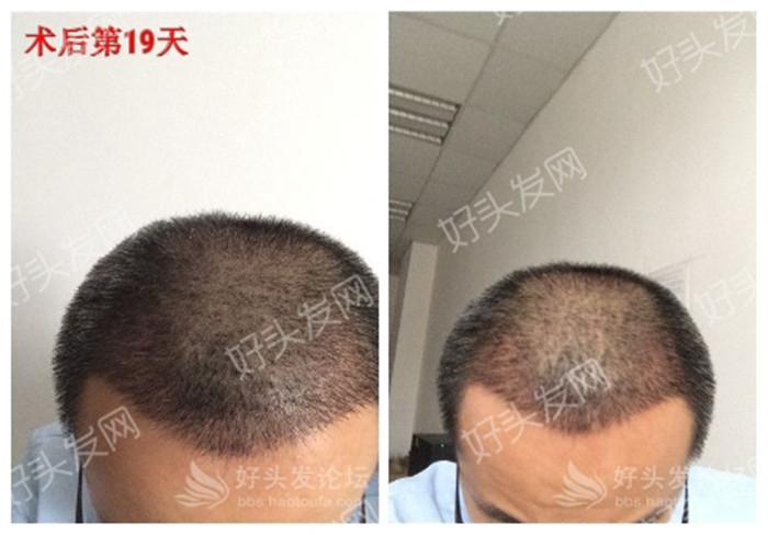 第十九天了,估计脱落期要来了,洗头的时候发现有几根头发,而且平时用手摸的时候,也会掉一二根,二边的头发长得快,植发区的头发没有原生发长得快,不知道是不是都是这样子,后脑勺摸上去不感觉痛了,只有轻微的感觉,前面的植发区有二个地方特别刺痛,就是那个点,不是范围大的那种,好像针刺一样,不用手摸就不会,过几天就可以用米诺了,希望脱落期快点过