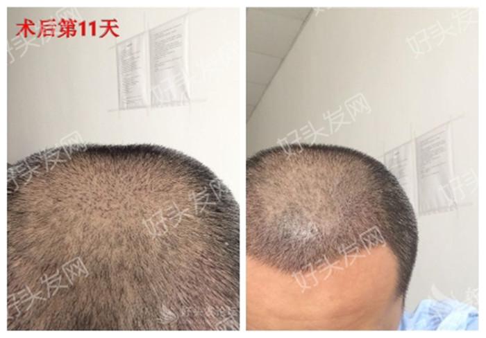 到了第十一天,血痂基本上都洗掉了,我是少白头,现在两旁白头发好多啊,植 的时候忘记叫医生帮忙把黑头发植到前面了