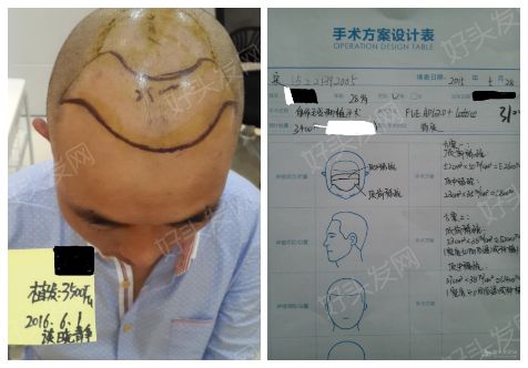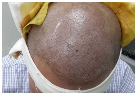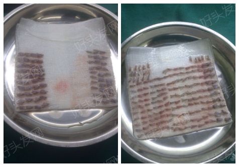 手术前体检测血压抽血化验,设计发际线,护士拍照,缴费。然后开始手术,我的手术是在下午两点半正式开始的,赵医生主刀还有三个护士,手术室播放的有音乐,趴在手术台上(就像浴室搓澡的长板凳一样,不过宽一些,前面有个圆窟窿头朝下把脸放进去,后枕部朝上方便医生取发),开始打麻药时的感觉就像被蜜蜂狠狠的蛰了几下也像有人用订书机在定你的头皮,不过疼痛还是可以忍的,为了蜕变重生这点痛不算什么,一会整个头发麻发胀感觉整个头都大了,十针过后整个头没太多感觉,持续的发麻发木,只能听见打麻醉时机器发出的声音,但整个人意识是完全清醒的还可以和医生有对话不舒服的可以告诉一声,护士在旁边不停地在忙着分离,我本来在数一共扎了多少针,30针后就不刻意数了因为打了太多针,粗略估计有上百针因为手术医生是一边用取发针取毛囊一边擦拭血液,提取一部分后再打麻醉针,整个过程持续了三个小时。确实有点煎熬,但这是每个想要重生的人必经的。医生多去了几百单位说是送我了用来加密,感觉挺好的。取完发后枕部包上厚厚的纱布,稍微休息一会,然后换成面朝上躺着的睡姿,准备由另一名辅助医生(看着也像是护士)种植毛囊,好像很多机构都是如此,主刀医生基本上主要是取发,种植头发很多都是由其他人来完成。在种植过程中主刀医生会来好几次看情况。又是3个半小时,不过比趴着舒服多了。护士会把毛囊摆放好,一小堆是十个单位一行十小堆即一行100单位,摆成十行就是1000单位,拿到你面前数给你看让你确认数量。
