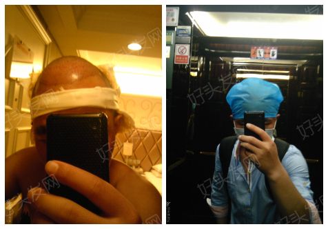 一直到晚上九点多才结束,护士又给拍的照,嘱托术后注意事项,睡觉前不要喝水,睡觉时躺着不要侧卧,不要用手碰植发区,出门带防尘帽,术后按时按量吃医生拿的消炎药,如果疼痛难忍医生拿的还有止痛药没有疼痛的情况就不用吃了,术后第一天换纱布,第二天拆掉纱布,第五天清洗血痂。一切结束后他们还提供的晚饭而且是热的就是工作餐,因为比较晚我对周边有不太熟,赵医生就亲自带我去的宾馆,一直等我在大堂确定好房间后他才走,当时觉得这些护士和医生真是热情耐心,并没有出现因为已经交过钱就不太理会你了的情况。靠谱的机构真的还挺重要服务很好。对了,去宾馆的路上因为又是纱布又是防尘帽在大街上回头率很高啊。回到宾馆后虽然已经很晚头皮发麻发木,但心里还是很高兴,我给家人打了电话,然后还专门给徐哥发了个短信说自己感觉自己重生了,重燃对未来的希望。 剩下的就是用心养护,耐心等待康复。虽然需要早睡熬夜不好,但当晚想早睡不容易,而且要枕的比较高保持仰躺的睡姿,很晚才睡。之前有发友术后出现比较疼痛的情形,我也以为会疼得睡不着呢,结果没想象中的那么痛竟然睡着了虽然很晚。6月2号术后第一天。早起一直待在宾馆,十点去换的纱布。在去的路上回头率依旧超高,但对这造型好奇的目光总比以前看着脱发时的异样目光好多了,压根没放在心上。换完纱布后直接回宾馆安心待着,才发现额头还是微肿,毕竟那么多的麻醉剂多多少少会肿的。其他的没什么异样也没有疼痛或痒的感觉,头皮只是发麻,还有就是因为手术和睡觉姿势的问题脖子不舒服,不过根本不算什么问题了,晚上去了附近的超市,回头率依旧很高,我都没当回事。只是晚上有点想感冒,因为下雨又刮风的可能身体有点受凉。注意好身体很重要,一旦感冒不利于恢复。所以我一直躺在被窝注意保暖防止感冒。