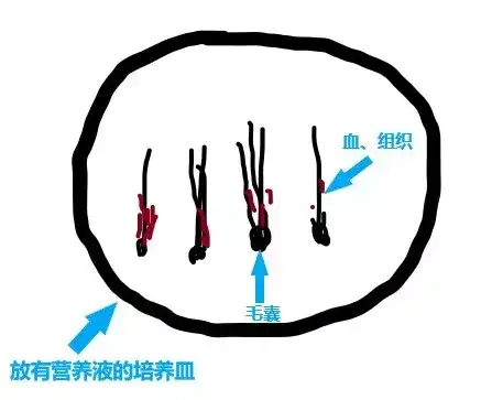 然后要对取出的毛囊单位进行处理,因为上面有很多多余的组织,接着放入营养液,以防毛囊坏死。(本灵魂画手又出现了)