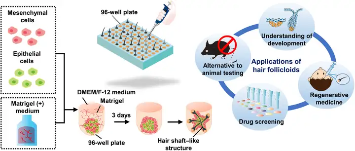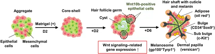 研究团队通过尝试各种体外细胞培养条件,包括且不仅限于培养基,生长因子,信号通路的激活剂和抑制剂等,让两种胚胎细胞在体外形成毛囊。