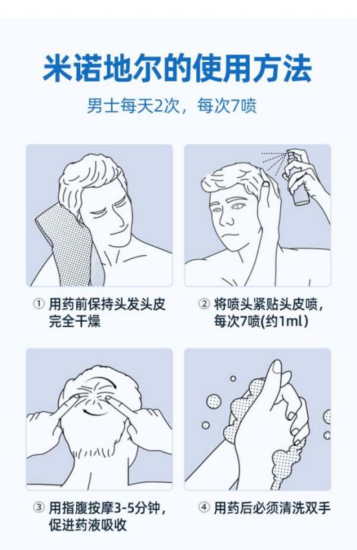 一般而言,早晚各一次,每次1ml。分开头发,直接将药液喷于头部脱发区,可以让其自然干燥;