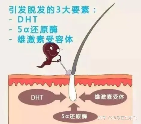 雄激素水平浓度高,睾酮会和5α-还原酶反应生成更多的活性很强的双氢睾酮(DHT),这些双氢睾酮(DHT)会对细胞的代谢系统产生作用,使带有“脱发基因”的前额和头顶这些遗传易感部位受到影响,出现脱发现象。而其它部位不携带“脱发基因”地方,即使双氢睾酮(DHT)进入细胞,毛囊细胞也不受雄激素影响,也不会脱发。