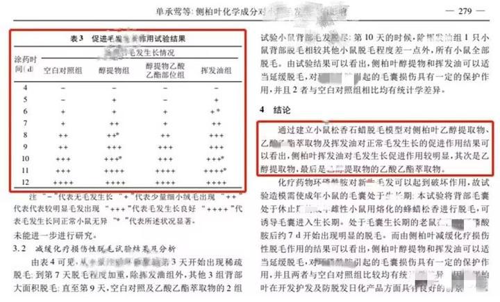 ^侧柏叶提取物(侧柏酮)中富含的黄酮成分能够激活毛母细胞、促进血液循环,使进入休止期的毛囊重新生长并能够加速养分供给毛囊,且有小鼠实验表明它能明显促进毛发生长。^文献论证:An Open-Label Randomized Multicenter Study Assessing the Noninferiority of a Caffeine-Based Topical Liquid 0.2% versus Minoxidil 5% Solution in Male Androgenetic Alopecia(关于0.2%咖啡因溶液在雄性脱发上和5%米诺地尔的效果的开放随机多中心评价研究)[1]^苗勇 孙亚彬 王雯珺 张志丹 姜金豆 李泽华 胡志奇,6-姜酚对毛发生长影响的实验研究,中华整形外科杂志,2013年6期(448-452)
