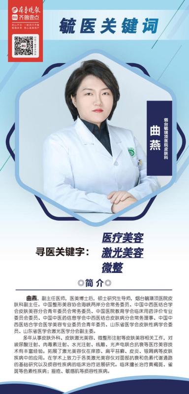 从激光美容、美白、抗痕到损容性皮肤病和医学美容方向,多年来曲燕从未放弃过学习和提升。作为山东省内唯一的医学美容专业的博士后,她在激光美容、注射美容、美容外科、功能护肤品研发等领域不断深耕,并持续精进玻尿酸、肉毒杆菌、水光注射以及线雕、光声电联合抗衰等医疗美容技术,力求最大程度为患者解决困扰。