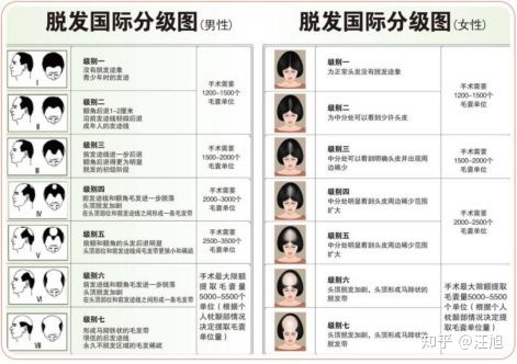 脂溢性脱发有个最明显的特征——油脂的分泌过度。 女性表现为头顶和额部稀疏,发缝逐渐变宽;男性表现为发际线上移和秃顶。对照下面国际脱发分级图,你现在是脱发几级呢?