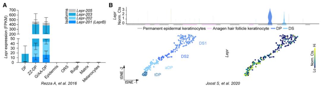 在这项最新研究中,为了确定靶向真皮乳头成纤维细胞的基因工具,研究团队筛查了小鼠毛囊细胞的单细胞转录组数据集,并确定 Lepr 是真皮乳头的标记基因。基于此,研究小组构建了 LeprB-Cre 转基因小鼠模型,用以研究毛发生长和毛囊新生的具体过程。