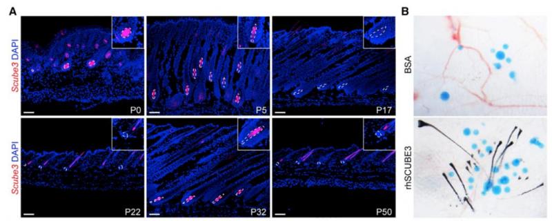 SCUBE3 是一种多功能蛋白,它可以以膜蛋白形式增强细胞上的 BMP 和 FGF8 信号,或以其蛋白水解裂解分泌形式增强细胞上的 TGF-β 信号。研究团队发现,在正常小鼠皮肤中,SCUBE3只在生长的真皮乳头中表达,而在休止期的毛囊中不表达。