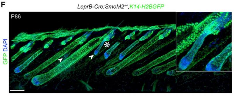 研究人员首先验证在 LeprB-Cre 小鼠的真皮细胞中激活 Hedgehog 信号通路是否会影响毛发的生长。值得注意的是,在正常情况下,Hedgehog 信号通路是胚胎毛发发育和适应性毛发生长激活所必需的。研究结果显示,激活真皮细胞的 Hedgehog 信号通路会刺激小鼠毛发的超活化再生。
