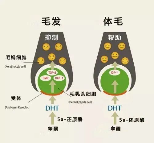 DHT在人体不同位置呈现的对于毛发的影响是不一样的。