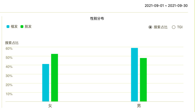 ▲百度搜索指数显示,搜索“脱发”的女性比例高于男性图片来源:百度指数