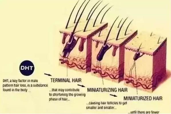 雄性激素脱发是由双氢睾酮(DHT)和遗传基因的双重作用下产生的。雄激素睾酮的代谢产物双氢睾酮作用于毛囊,使毛囊(头发)变小变脆弱,甚至坏死消失,所以毛发会变细变软,然后脱发,直到不会再生长出头发。
