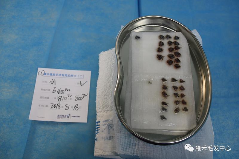 8月18日,成都雍禾采用FUE为刘女士植发1610单位,含单根头发的毛囊单位810,含多根头发的毛囊单位800,本来术前预估种植1600,结果多取种10单位。整个手术3小时,总体感觉不错。大家看一下图片,她的种植区比较大,特别是两个额角和颞角部位偏大,1600单位的量真的不算多。术后,她就回宜宾上班。