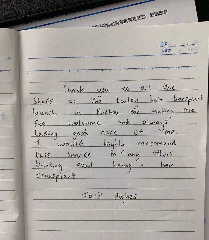 最近这几天,小哥哥又来做理疗啦,还很开心的和医院的咨询师小姐姐们合照,还手写了一封小小的感谢信,表达了自己来大麦做微针植发,对效果很满意。还说自己也会推荐给有植发需要的小伙伴。