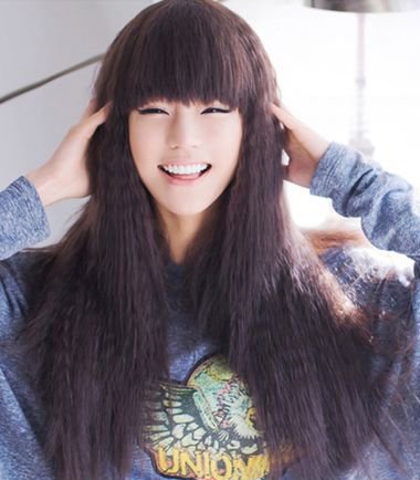 将脸颊两侧的头发梳成比较饱满的内扣曲线,女生齐刘海玉米须烫卷发发型,要将脸颊上的头发做成比较蓬松的曲线,烫发发型在胸口上的发丝有纤薄的层次,梳起来大方又充满时尚感。
