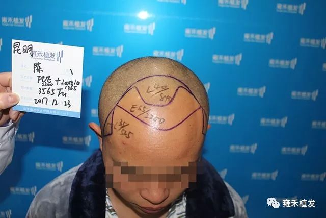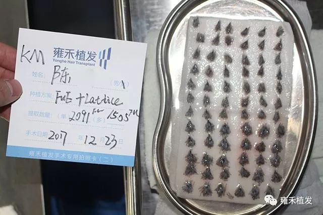 2017年12月23日,昆明雍禾为小陈种植3596单位,含单根头发的毛囊单位2091,含多根头发的毛囊单位1505,对了,这是两种技术种植,发际线后退的空白区是FUE,头顶中央及额角两侧向鬓角下垂处是稀疏区用LATTICE点阵加密,用了1365单位吧。本来术前预估种植3565单位,手术中实际多取种31单位。LATTICE是雍禾专用的种植技术,不开刀不打孔见缝插针种植,并且是V型而非U型终端,不会伤及稀疏区的原有头发。