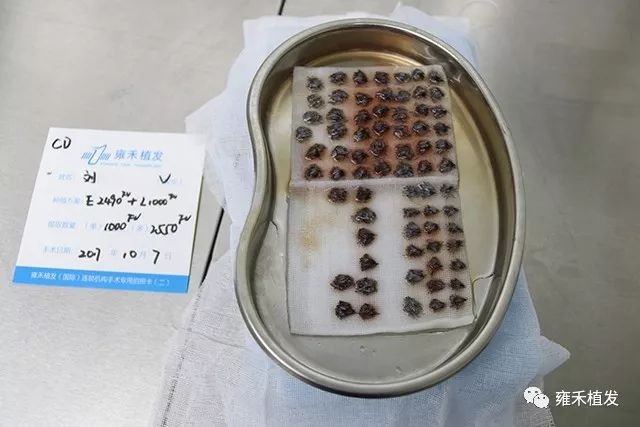 2017年10月6日,他趁着国庆长假的尾巴来成都雍禾咨询,一番交流,他是对植发和雍禾信任有加,因为当天手术已满,便交钱预约了第二天的手术。10月7日,成都雍禾为刘先生种植3550单位,含单根头发的毛囊单位1000,含多根头发的毛囊单位2550;大部分用FUE种植,只有头顶偏上的稀疏区种植了1000单位的LATTICE。本来术前预估种植3490单位,结果多取种60单位。