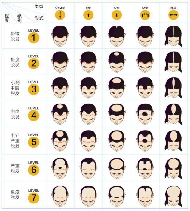 其实,脱发离真正的“秃”还是有一定的距离的。脱发也会分程度和等级。下面咱们就来看下,脱发级别具体怎么区分。