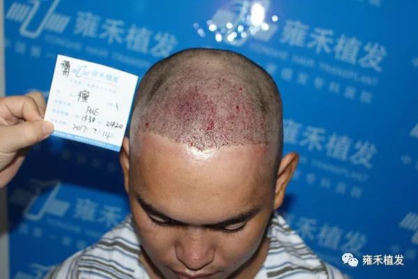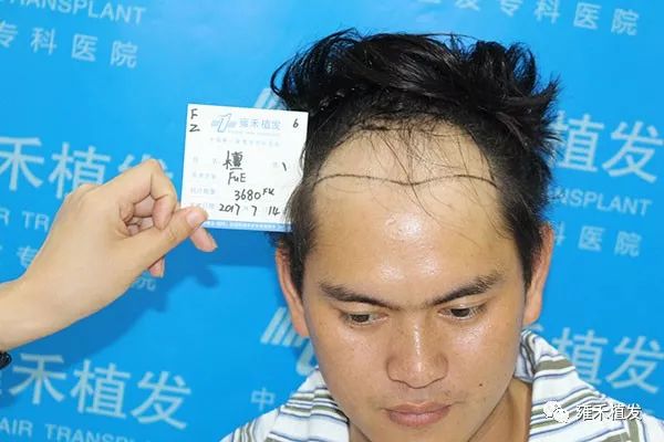 2017年7月14日,也就是一年当中最热的时候吧,福州雍禾采用FUE为小檀种植3750单位,其中单根头发的毛囊单位1330,多根头发的毛囊单位2420;本来术前预估种植3680单位,结果多取种70单位。脱发面比较大,种植量也就相应地比较大。插一句,雍禾的FUE是国内第一个经ISO9001认证的,无痕化,高密度,高成活率。